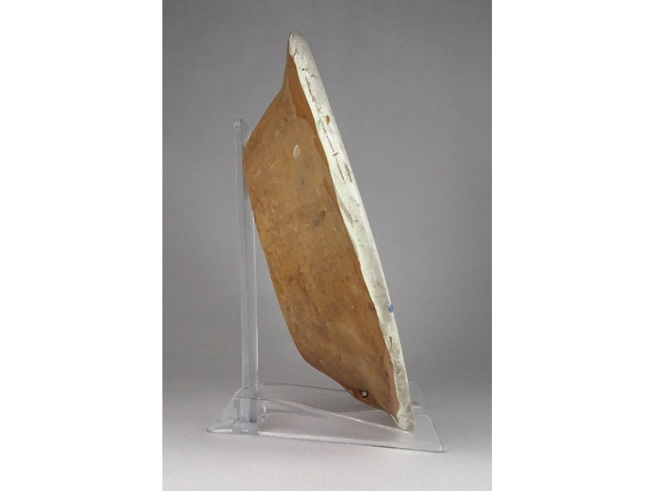 Antik, gyönyörű állapotban megmaradt, fehér mázon kék kézifestéssel díszített cserép tál, falitál. Akasztási lehetőséggel rendelkezik. Az akasztója fejjel lefelé került rá.