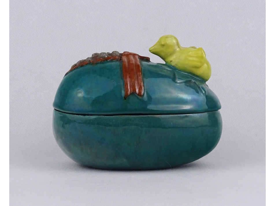 Régi, hibátlan állapotú, jelzetlen, art deco tojás alakú kerámia bonbonier tetején csibével és gyöngyvirággal. A csibe bal szárnya restaurátor által szakszerűen javított.