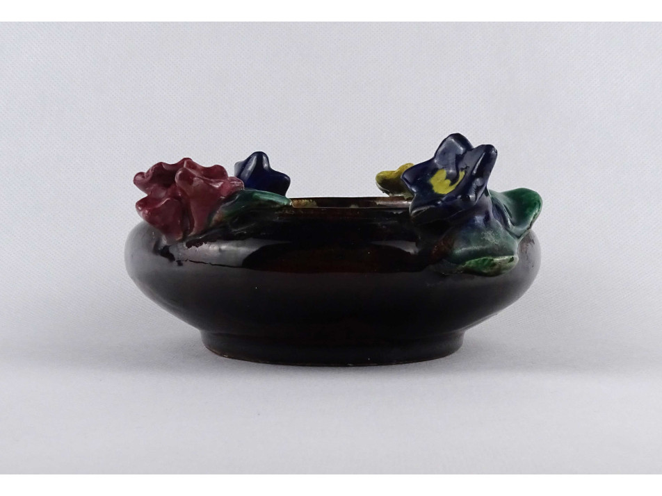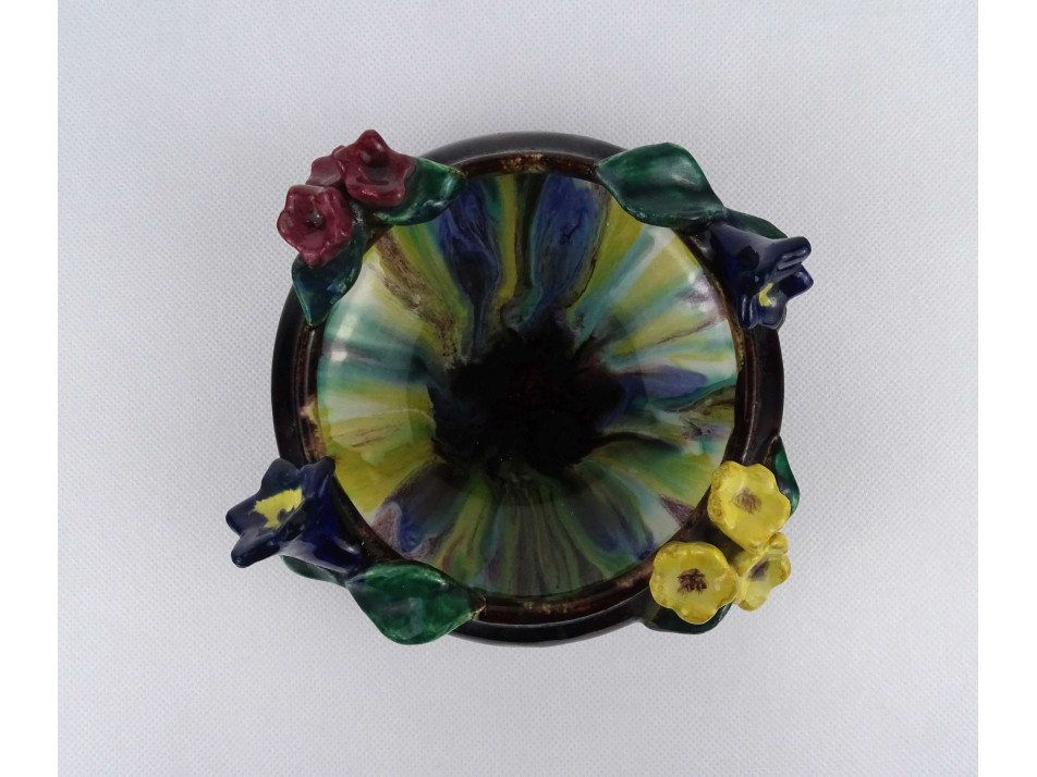 Régi, hibátlan állapotú, jelzetlen, belül folyatott mázas kerámia tál, hamutál, rajta színes plasztikus virágdíszítés látható.