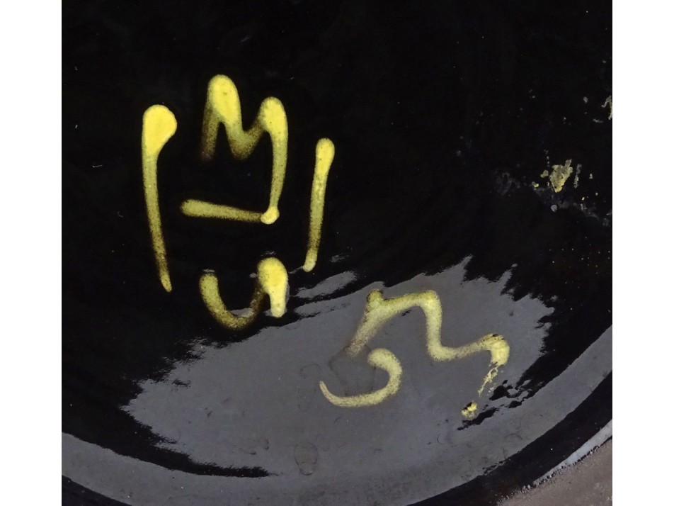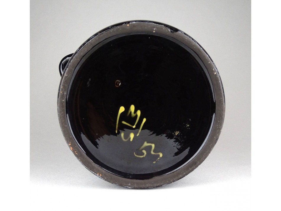 Régi, szép állapotú, fekete mázas, kézi festésű virágokkal díszített, két füles nagy méretű kerámia edény.