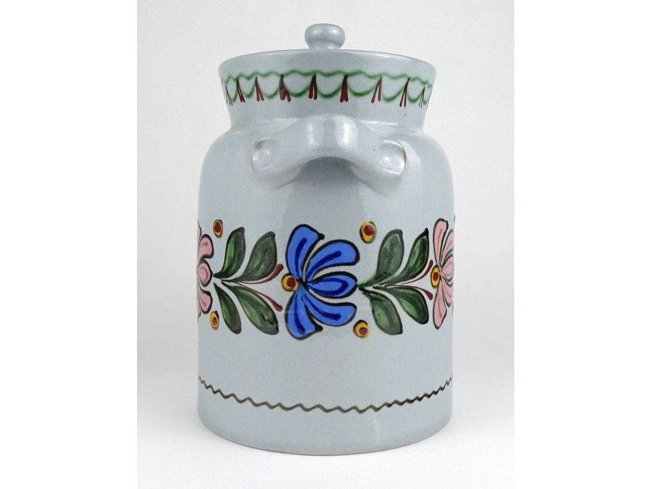 Nagy méretű, jelzett, szürkéskék színű, mázas, kézzel festett vásárhelyi fedeles cserép edény, szilke.