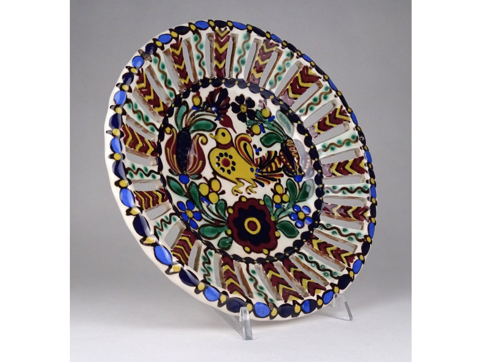 Régi szép állapotú, akasztási lehetőséggel rendelkező, áttört szélű gyönyörű hódmezővásárhelyi fehér mázas kerámia falitál, falitányér. Rajta élénk színekkel, kézi festéssel díszített népi szecessziós motívumok, közepében madár díszítéssel.
