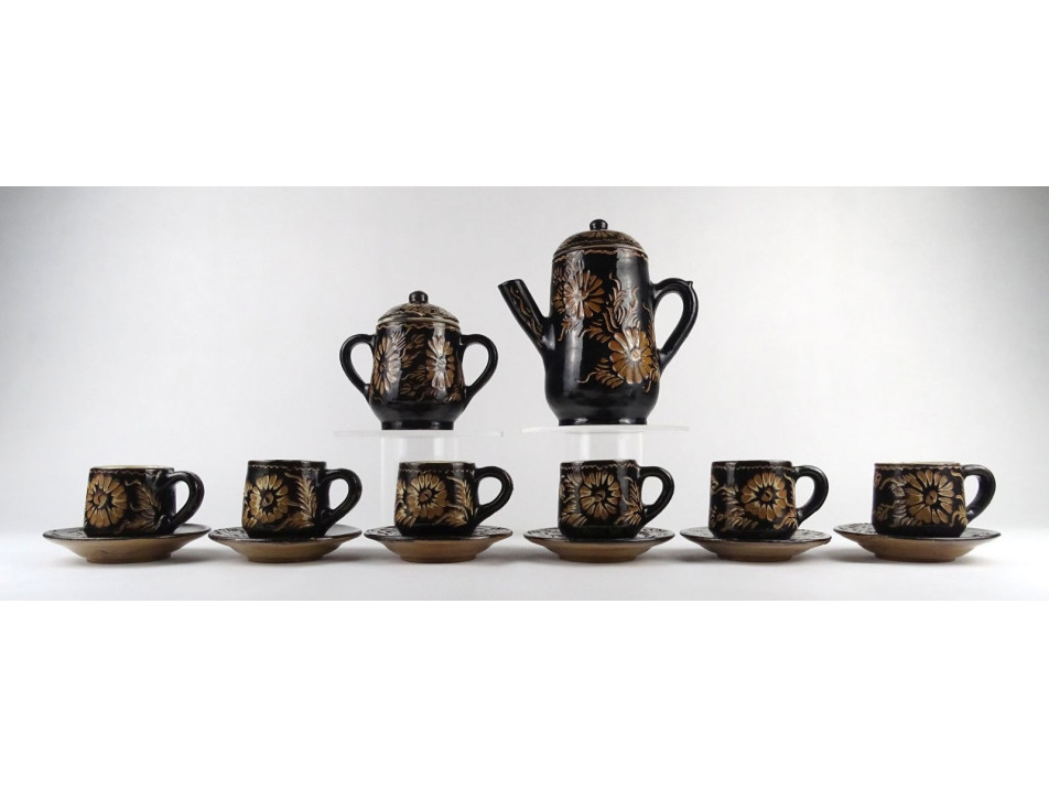 Szép állapotú jelzetlen korondi fazekasmunka, barna mázas kerámia kávéskészlet. Kisebb mázkopások előfordulnak.