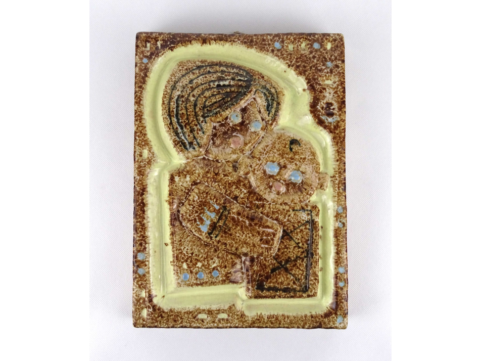 Régi, hibátlan állapotú, retro Zsolnay, mázas pirogránit falikép, anyát gyermekével ábrázoló falidísz, mid century kerámia dombormű, falra akasztási lehetőséggel.