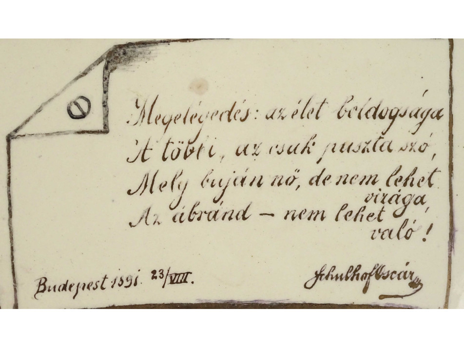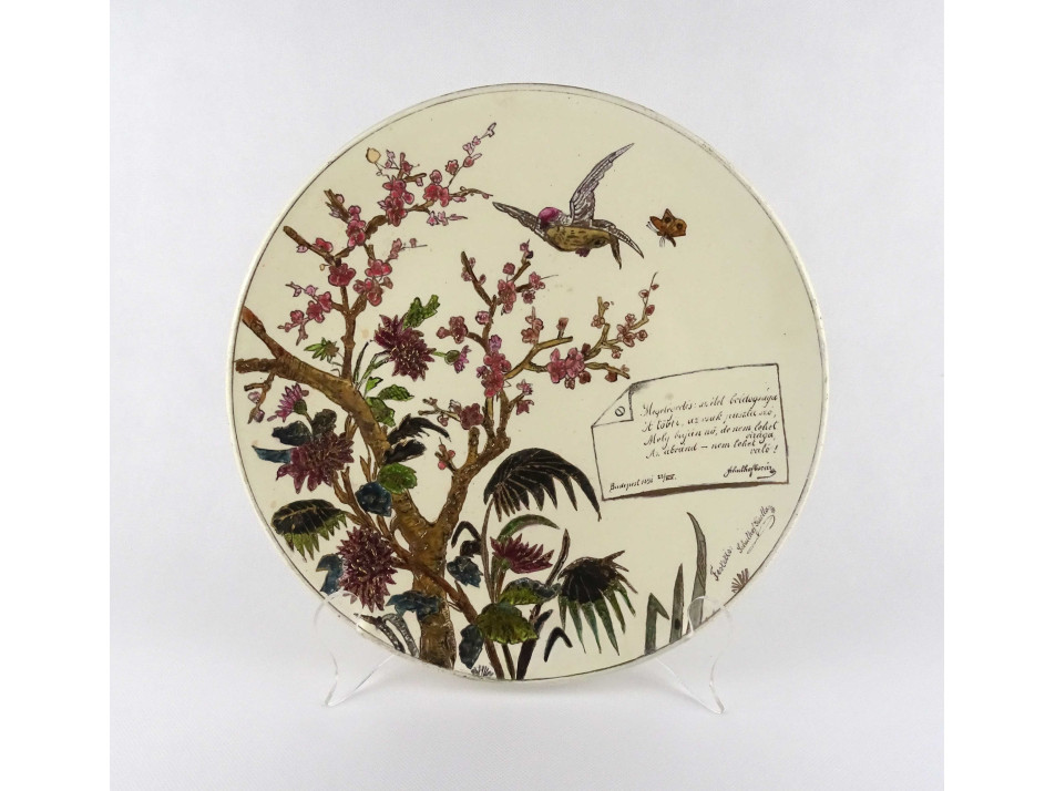 Hatalmas méretű, hibátlan állapotú, falra akasztási lehetőséggel rendelkező, vajszínű, aranyozott majolika Josef Steidl fali tál, nagyon szép kézi festésű virág és madár díszítéssel, datált felirattal.