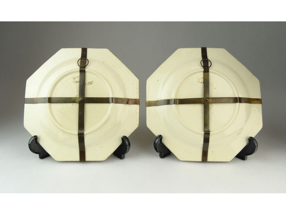 Antik, jelzett, falra akasztási lehetőséggel (rézzel pántolt) rendelkező, hibátlan állapotú, kézzel festett, gazdagon díszített majolika dísztál párban. Gyönyörű Zsolnay szintű darabok!