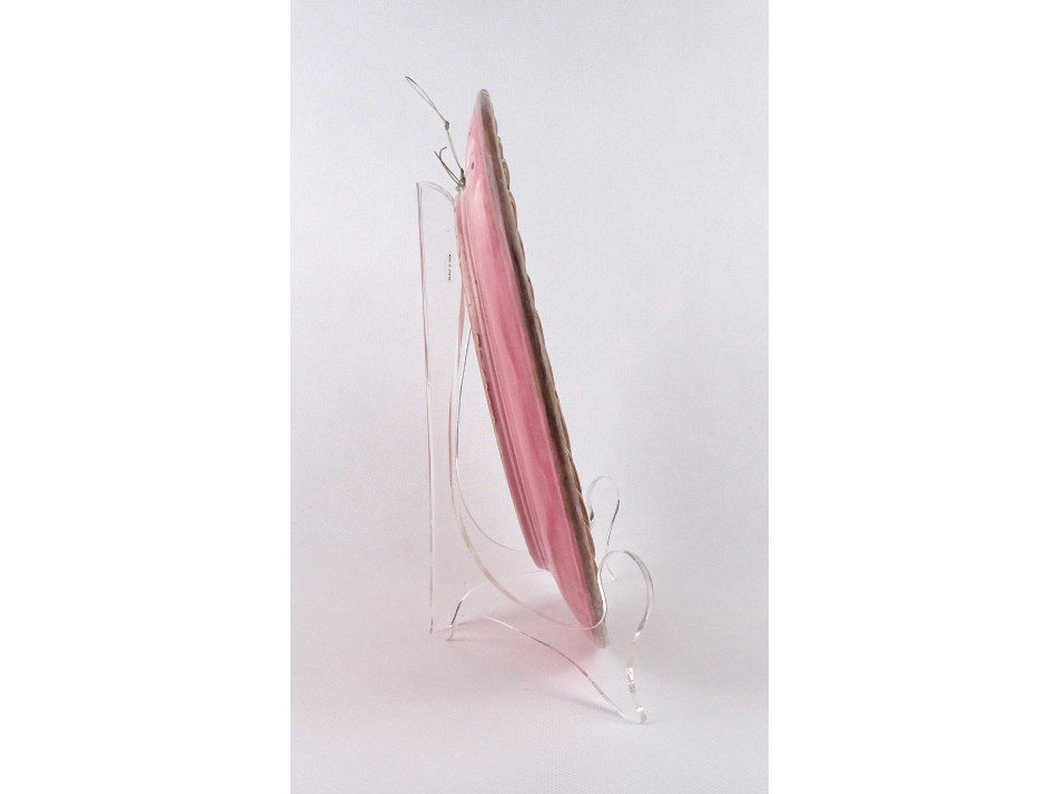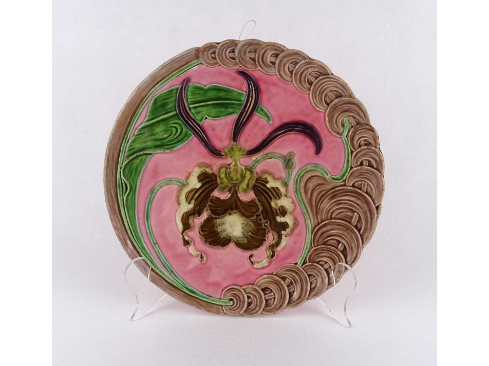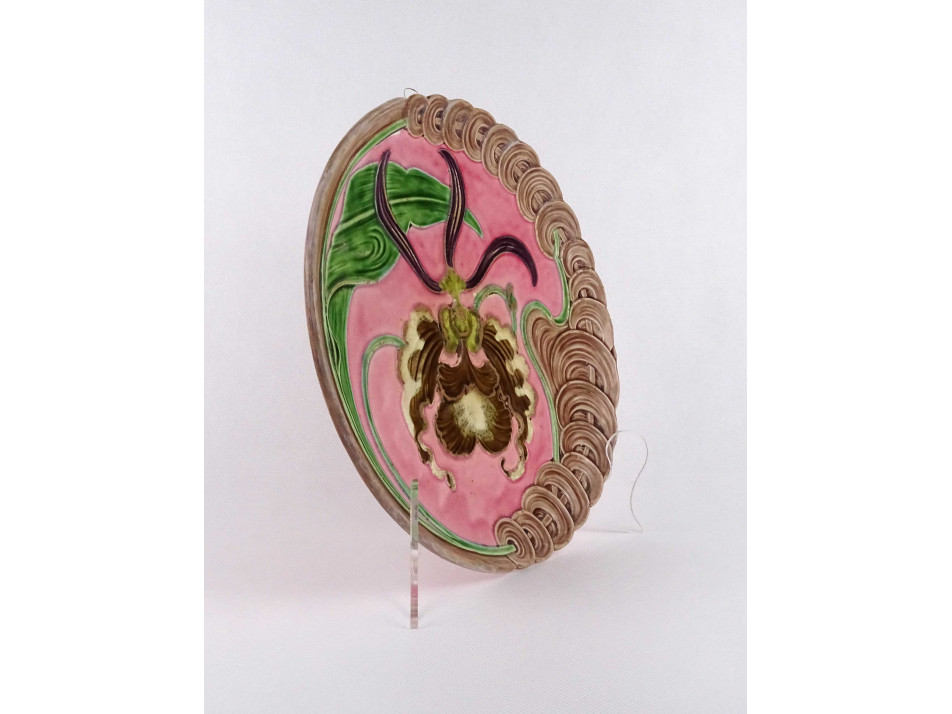 Antik, nagyméretű, hibátlan állapotú, plasztikus orchidea virággal díszített, jelzett szecessziós majolika falitál, dísztál falra akasztási lehetőséggel.