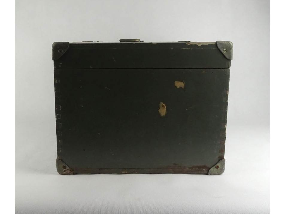 Régi kisméretű szürke színű fa láda, katona láda, fenyő láda. Fém füllel rendelkezik. Belseje osztott, párnázott és kissé viseltes. Két fém füle plombálható.