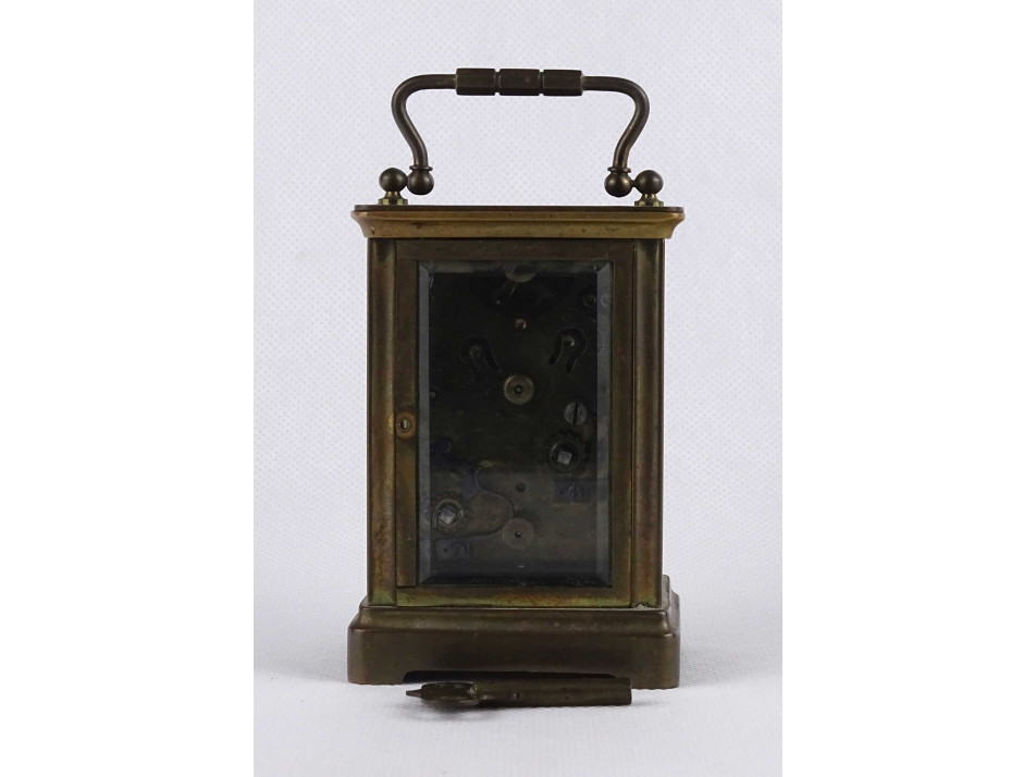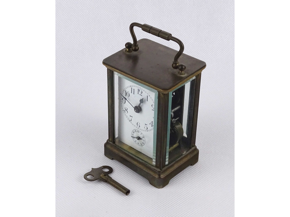 Antik, kisméretű, füllel rendelkező, réz házas utazó óra, körben metszett üvegbetétekkel. Alján csengő, szerkezete ébresztős. Eredeti felhúzókulcsa is megvan. Az óraszerkezet jár, az ébresztő szerkezet működik.