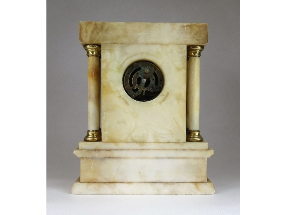 Régi, szép állapotú hat oszlopos világos márvány német kandalló óra. Az oszlopok alját és tetejét réz veretek díszítik. Ruhla óraszerkezettel. A szerkezet javításra szorul.