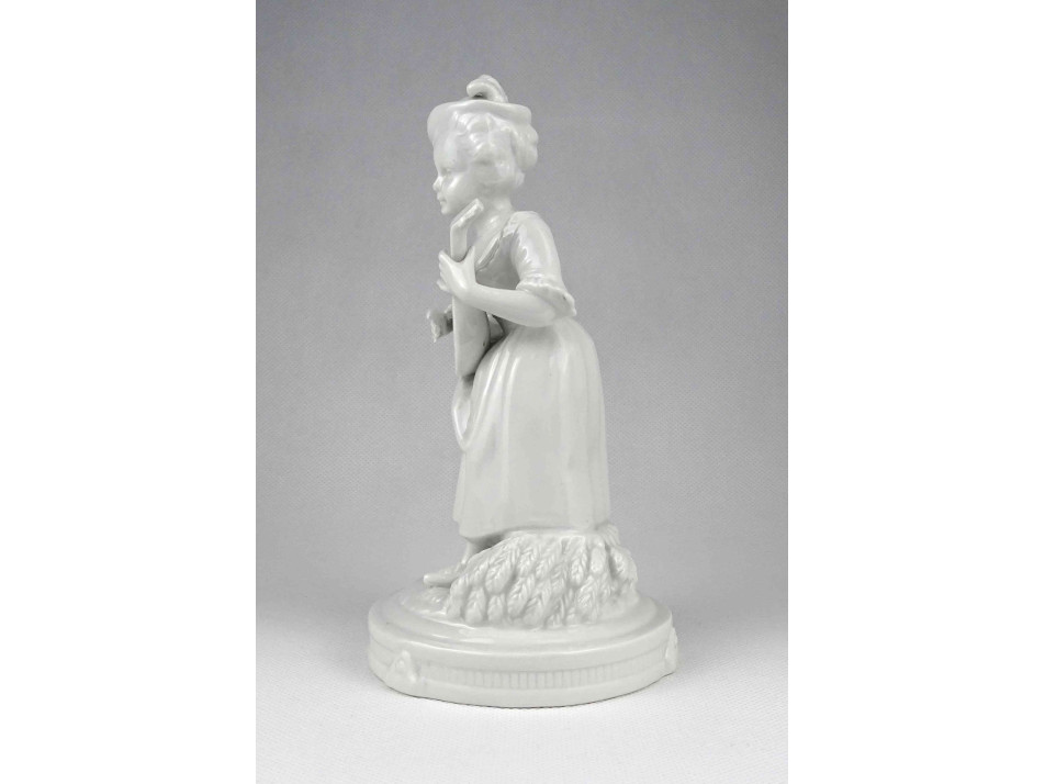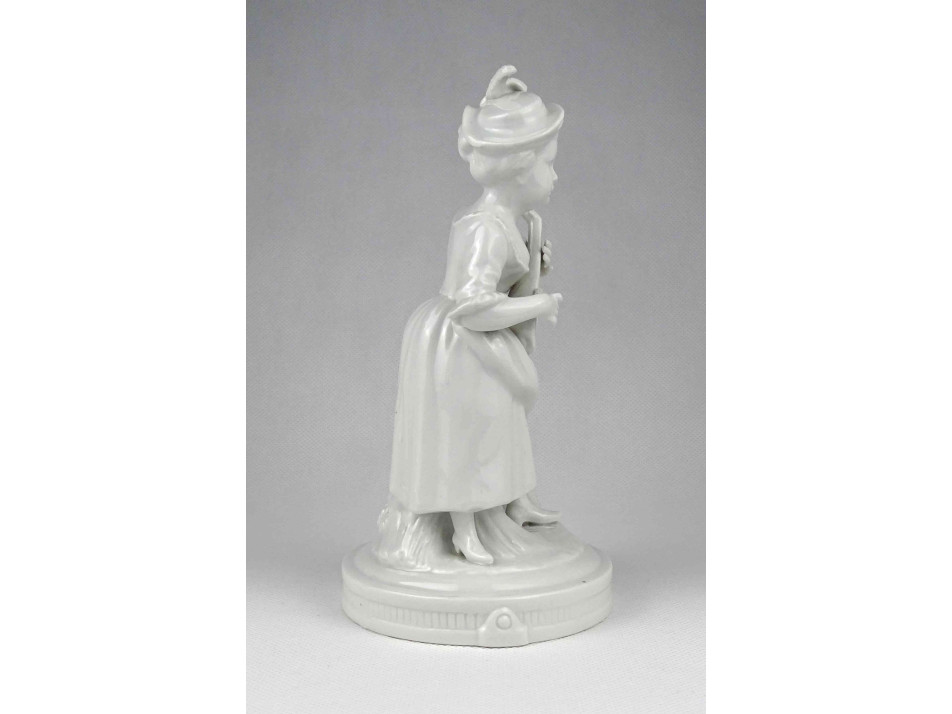 Antik, jelzetlen, német festetlen fehér porcelán figura az 1900-as évek elejéről. Kalapos kislány kezében lanttal. Jobb kezének mutatóujja restaurátor által szakszerűen javított.