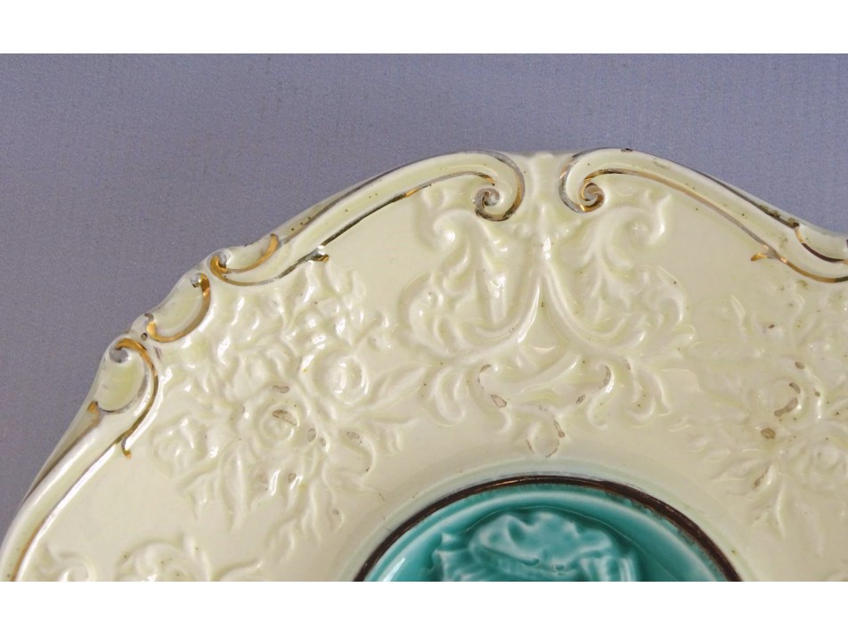 Antik barokkos díszítésű, vajszínű fajansz dísztányér párban.