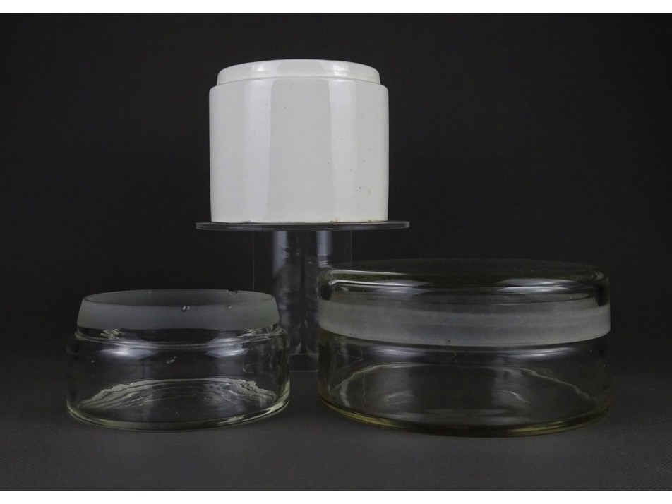 Régi szép állapotú laboratóriumi üveg és kőporcelán edények. Az egyik darabon kisebb sarkán kisebb sérülés található, lásd fotó.