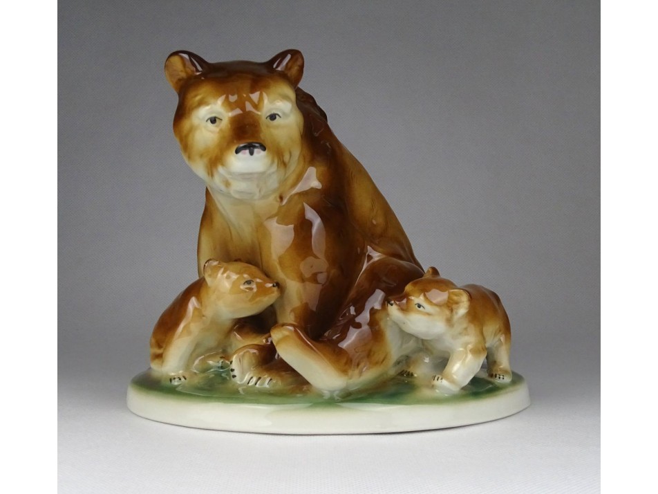 Hibátlan állapotú, talapzaton álló porcelán figura csoport. Medve mama és bocsai.