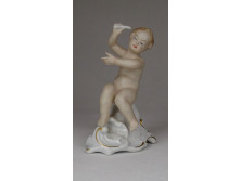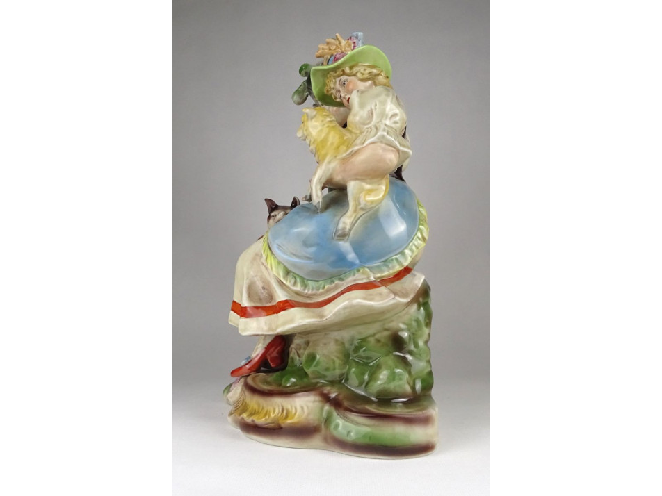 Hibátlan állapotú, nagy méretű porcelán szobor pár talapzaton. Kalapos hölgy báránnyal és kalapos férfi kutyával.