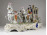 Régi, kapitális méretű jelzett német porcelán szobor aranyozott barokk talapzaton. Királyi, királynői hintó, személyzettel, négy lóval. Gyönyörű, kézi festéssel díszített, gazdagon aranyozott szoborcsoport. A hintó tetején és a talapzaton áttört korona díszítés található.