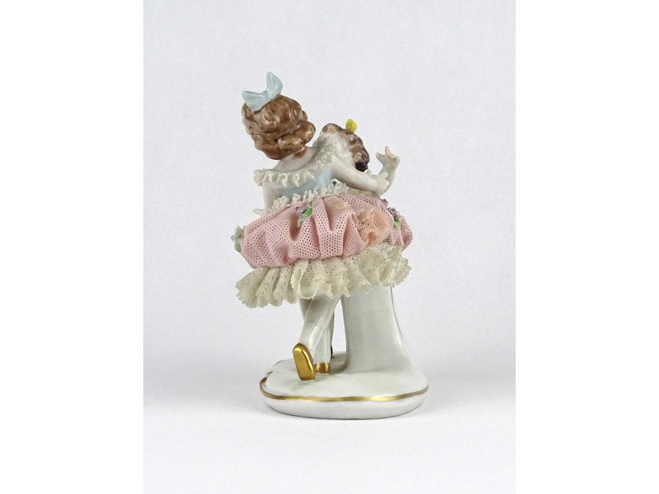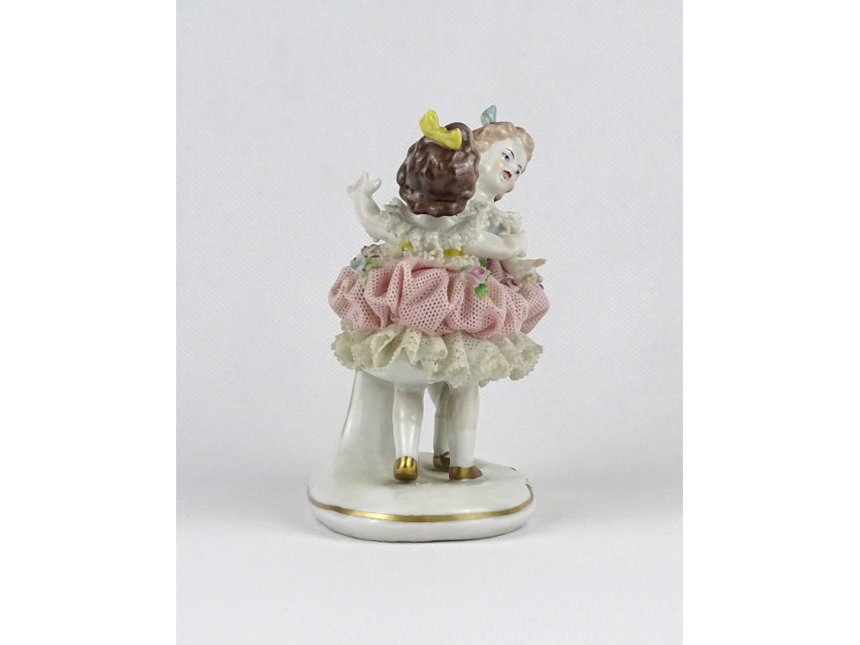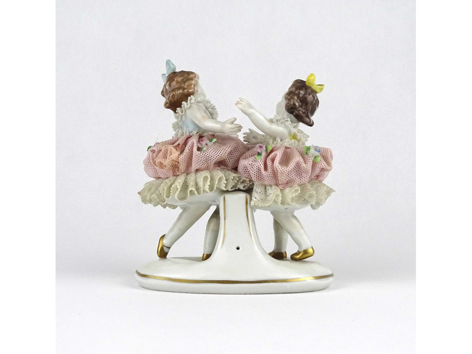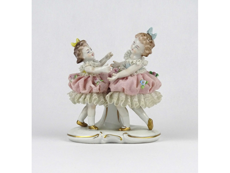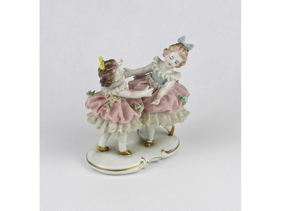 Antik, szép állapotú SITZENDORF porcelán figura, táncoló csipkeszoknyás kislány pár. A csipkeszoknyákon pár apró sérülés található