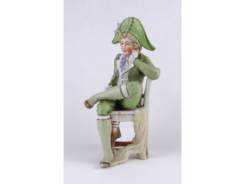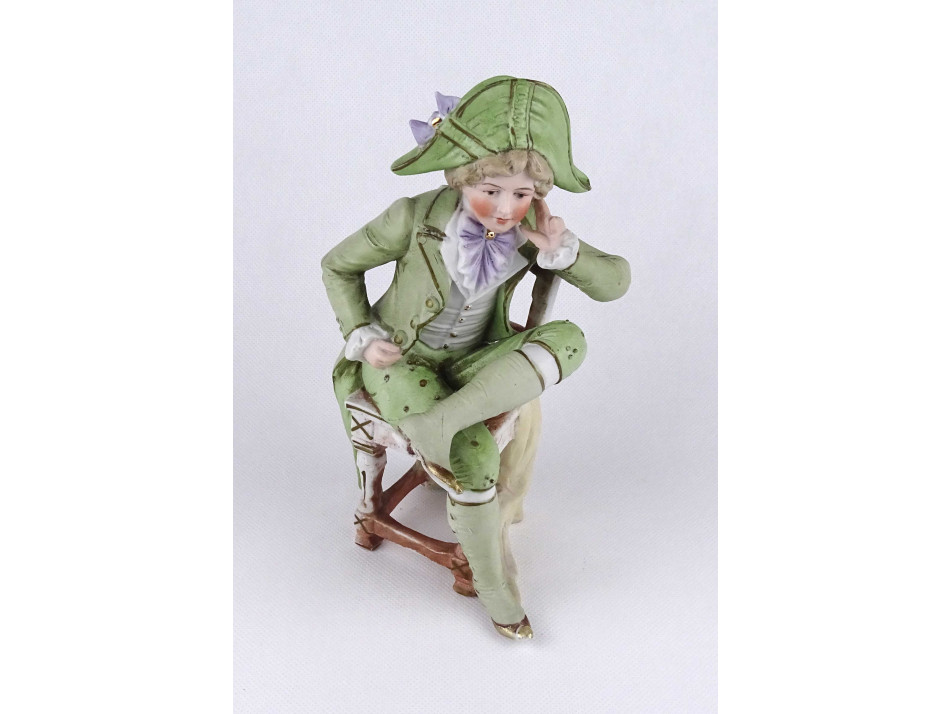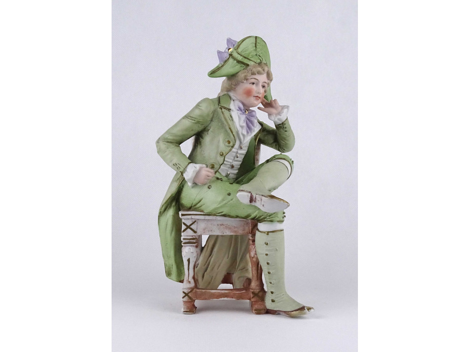 Hibátlan állapotú régi német porcelán figura. Székben ülő rizsporos, parókás barokk férfi. A cipői orra restaurátor által szakszerűen javított.