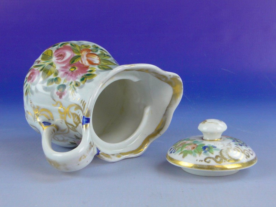 Antik, 1850-1880 körüli Meisseni jellegű, gazdagon díszített barokkos formájú, vastagon aranyozott, kézi festéssel díszített, porcelán kiöntő.
