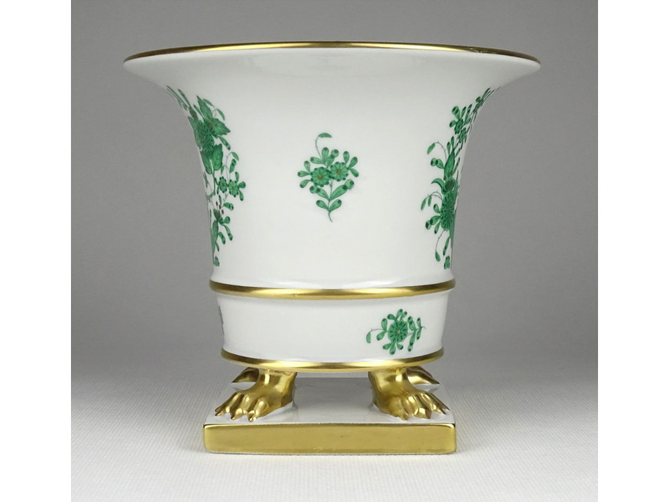 Hibátlan állapotú, oroszlán karmos, zöld indiai kosaras mintás Herendi porcelán kaspó, virágkaspó, díszkaspó.