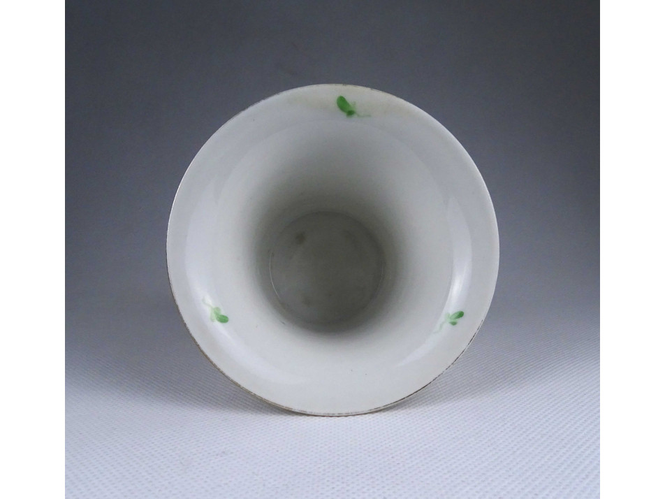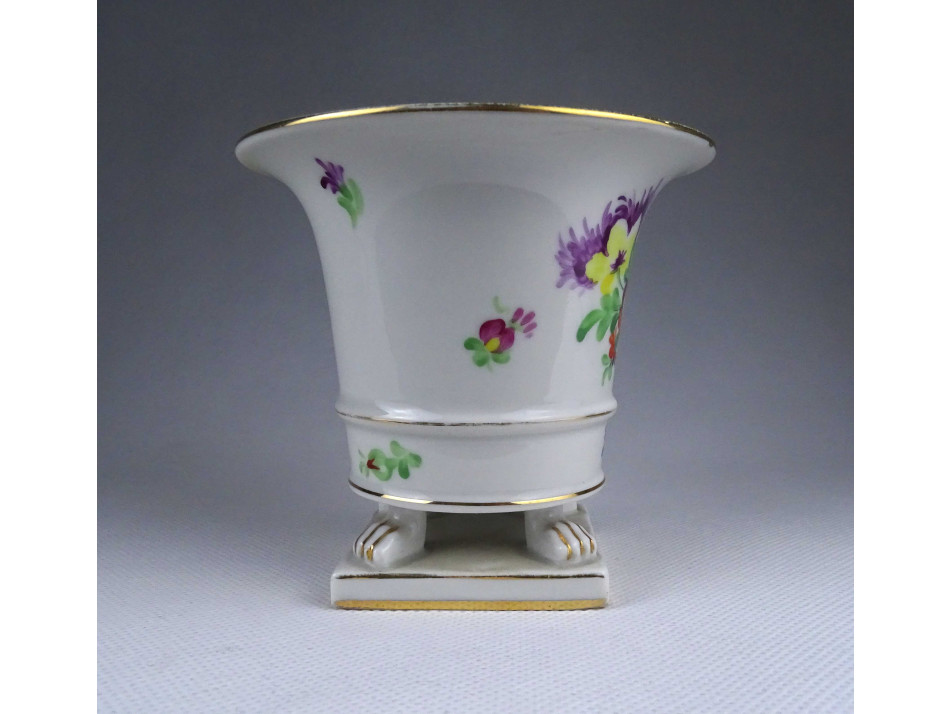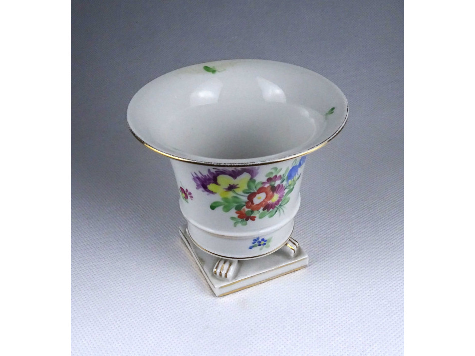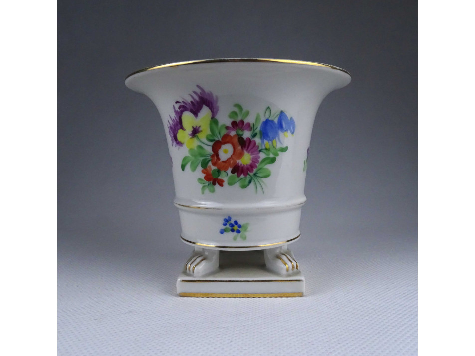 Antik, szép állapotú, kézi festésű virágmintás, a peremén aranyozott, oroszlánlábakon álló, Herendi porcelán kaspó. A peremén felül egy helyen pókhálószerűen szétfutó, elszíneződött mázrepedések láthatóak.