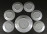Régi szép állapotú, jelzett porcelán süteményes készlet. Szélén irizáló felületű, közepén többalakos allegorikus jelenetekkel díszített készlet.