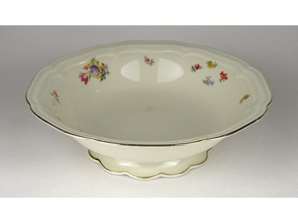 Hibátlan állapotú, jelzett, virágmintákkal díszített vajszínű német talpas porcelán kínáló tál, asztalközép kínáló, gyümölcskínáló tál.