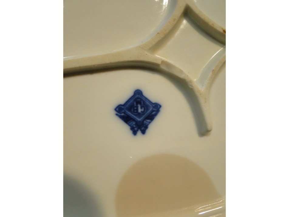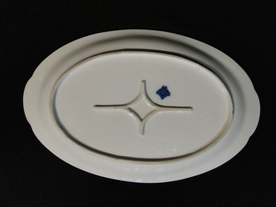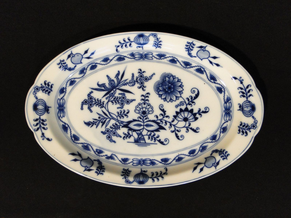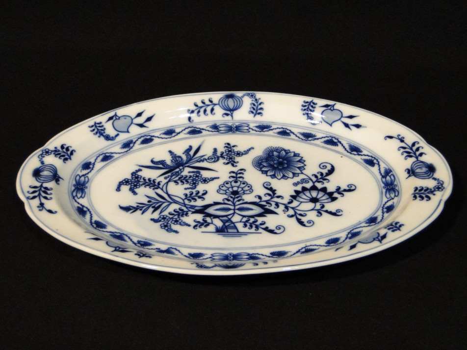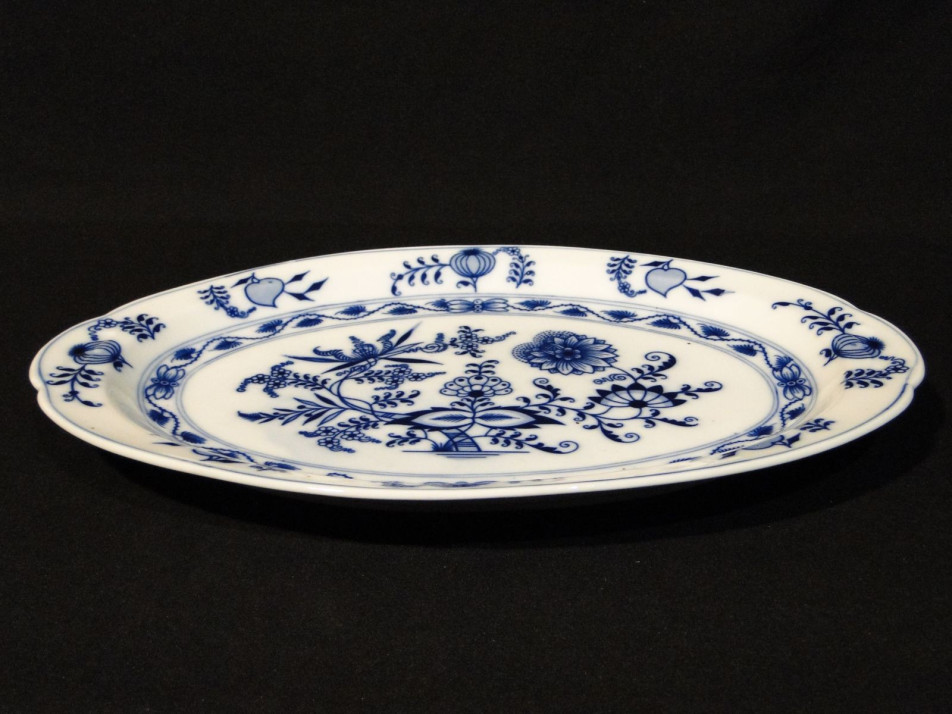 Kék-fehér mintás hibátlan meisseni jellegű ovális pecsenyés tál. Alján kék jelzés GBM (Gesellschaft Brüder Martin) monogrammal.