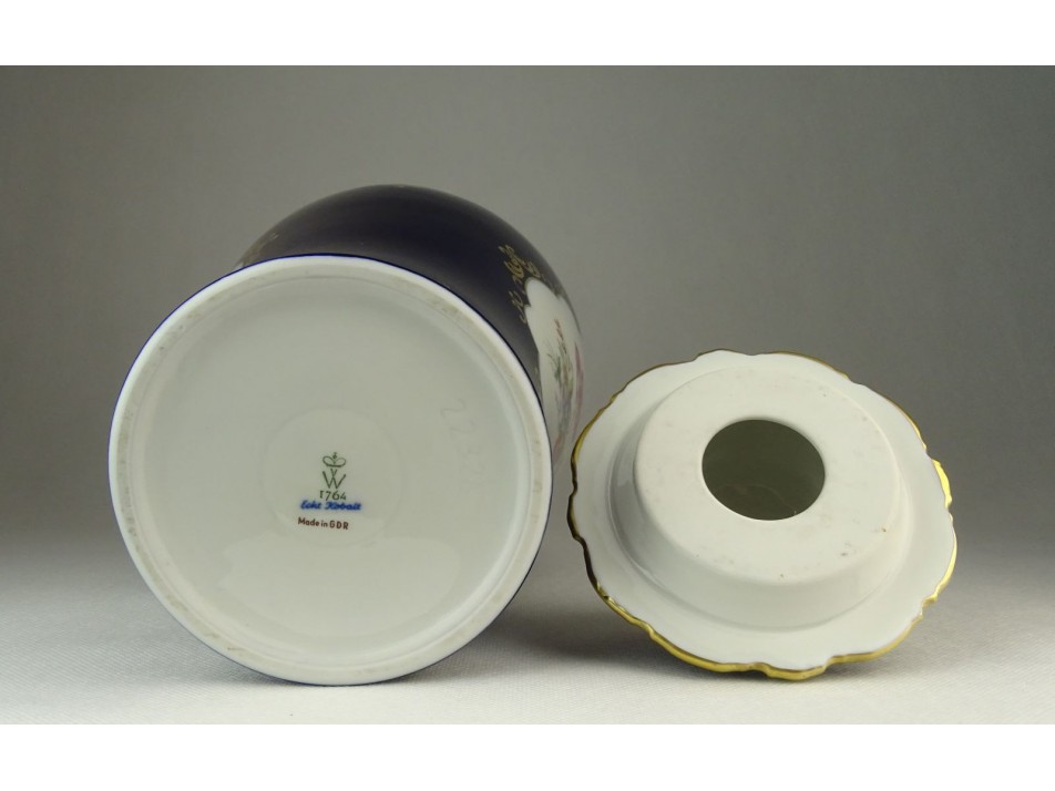 Hibátlan állapotú, nagyméretű, kobaltkék színű, gazdagon aranyozott, virágdíszes, jelzett porcelán díszváza, urna.
