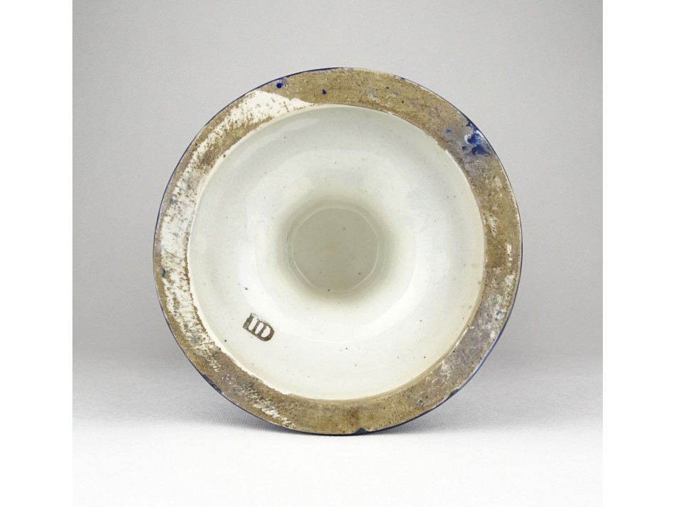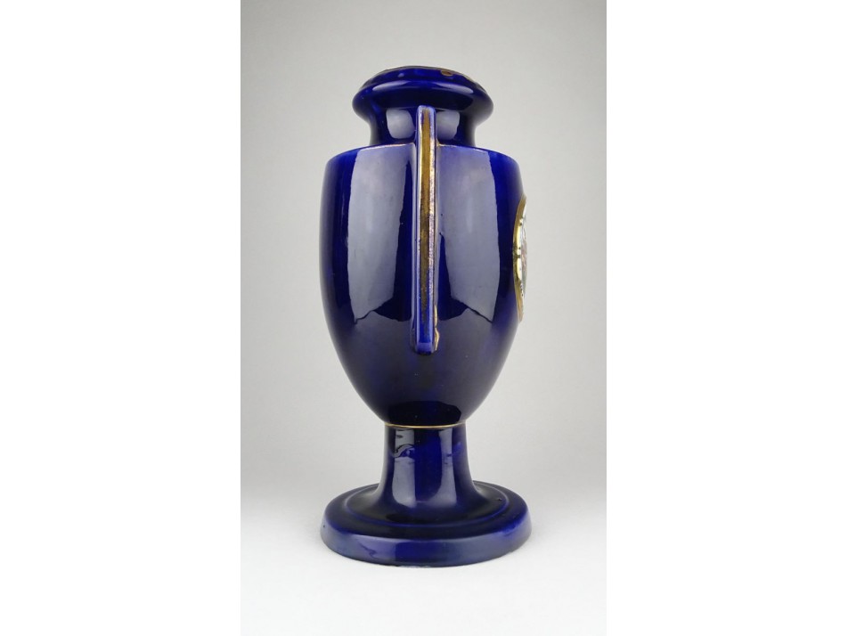 Régi, arannyal gazdagon díszített, kobaltkék színű, talapzaton álló porcelán serleg, kehely. Oldalán három alakos allegorikus jelenet. talpát profi restaurátor javította.