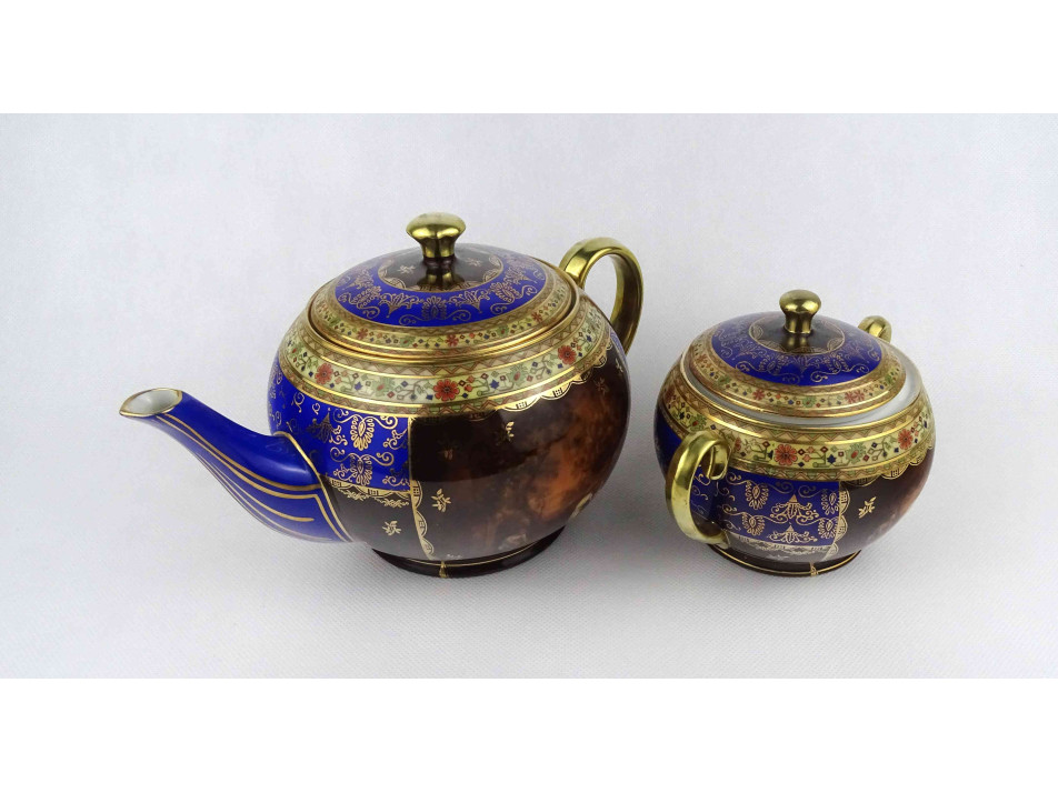 Antik kék - arany színű jelenetes Altwien porcelán teáskanna és bonbonier