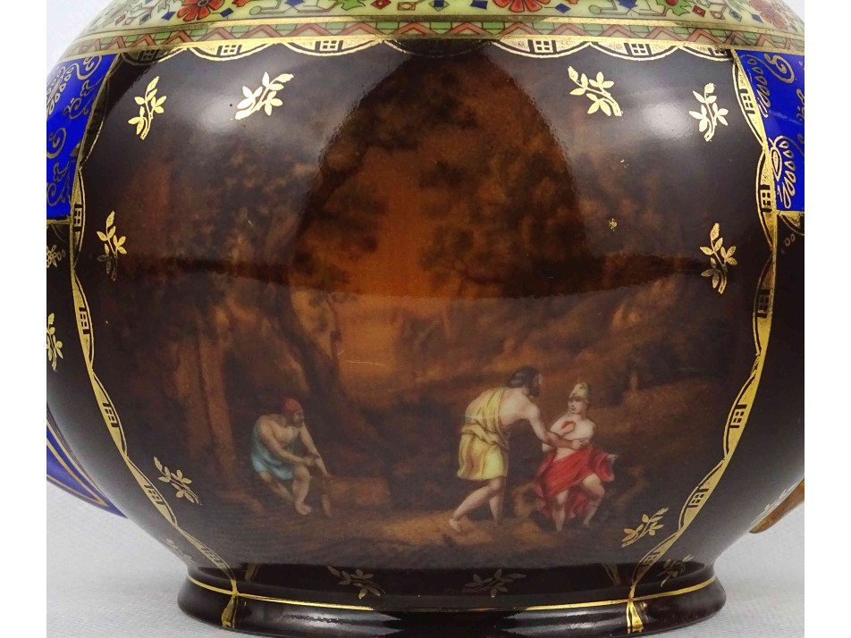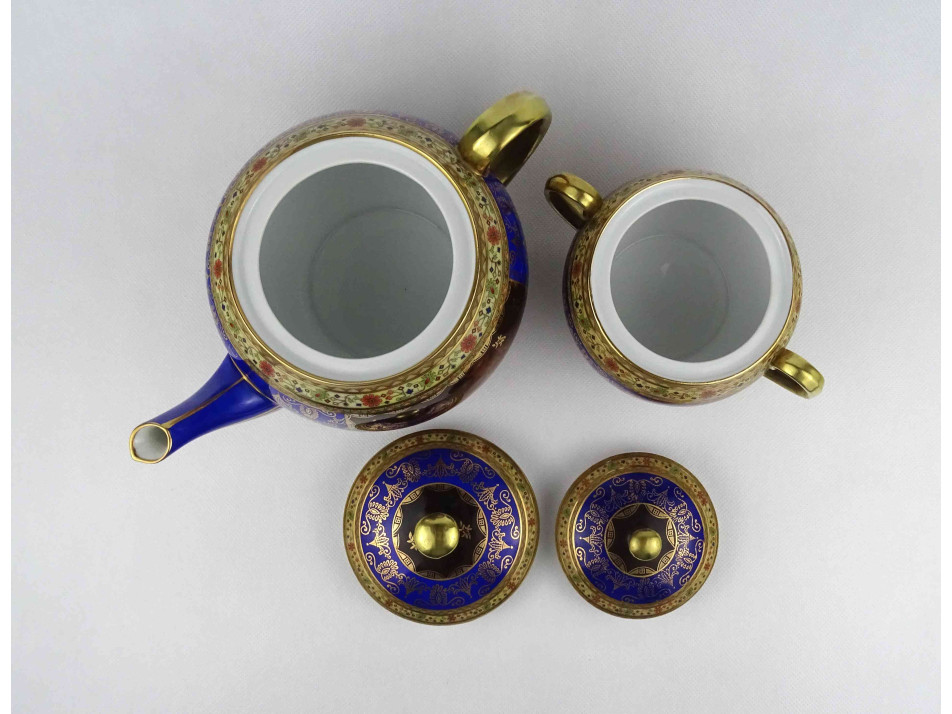 Antik, hibátlan állapotú, jelzett, vastagon aranyozott, kobaltkék színű, antik jelenettel díszített Altwien porcelán teáskanna a hozzá tartozó bonbonierrel.