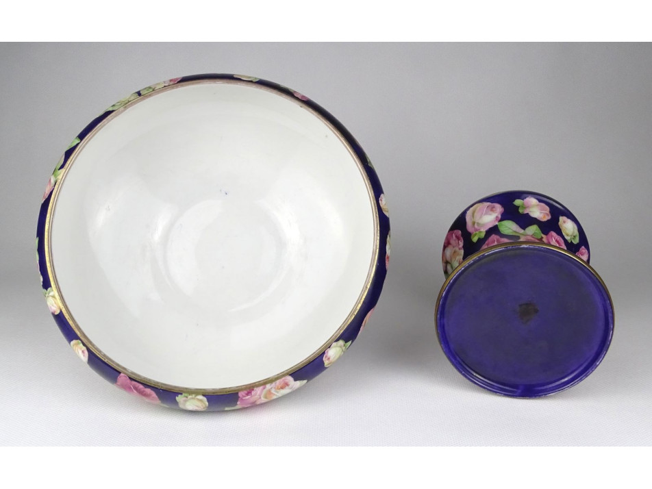 Régi, hibátlan állapotú lila színű, rózsákkal díszített porcelán asztalközép kínáló tál. Két darabból áll, külön, láb nélkül is használható a tál.
