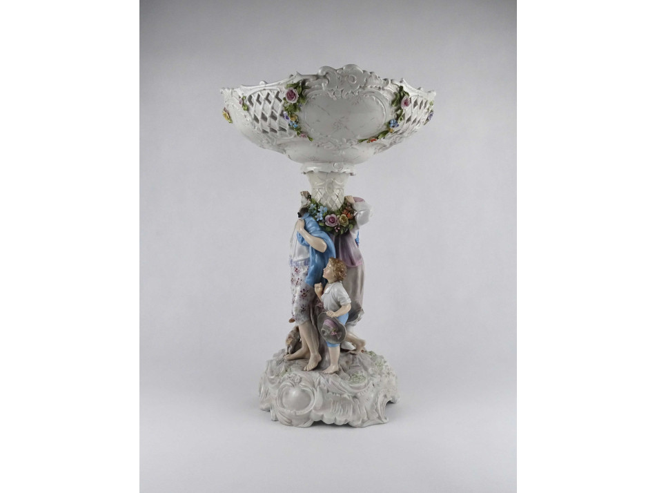 Antik, 19. századi hatalmas méretű, négyalakos figuracsoporttal díszített Volkstedt Rudolstadt porcelán kínáló, asztalközép, gyümölcskosár. Sajnos a férfi figura feje eltört és több apró kis hiba, lepattanás található a kosár virágjain is. Ennek ellenére impozáns darab.