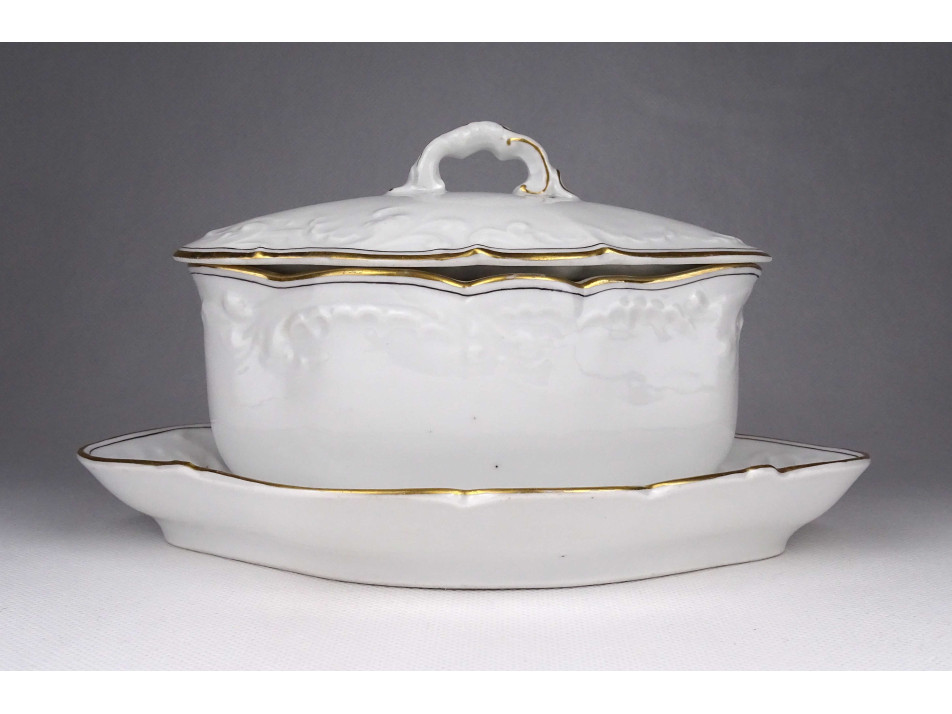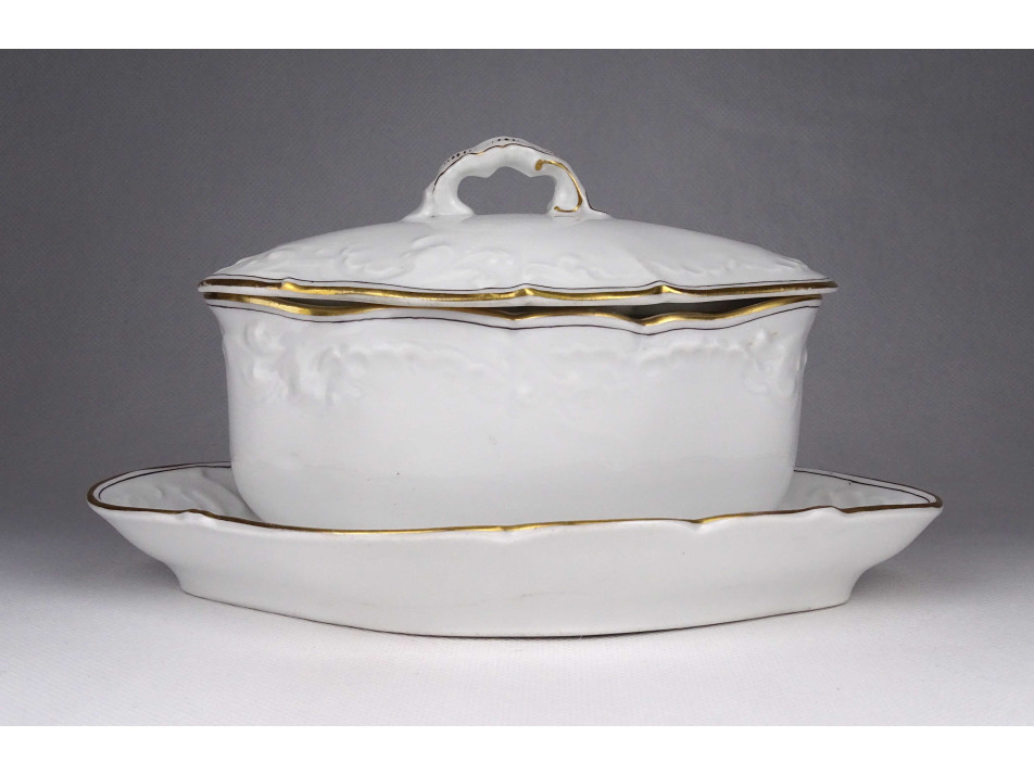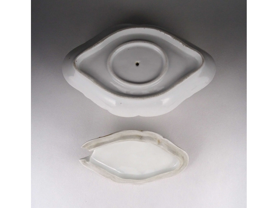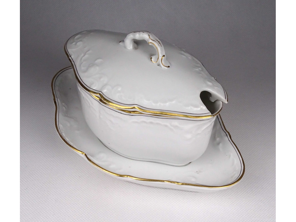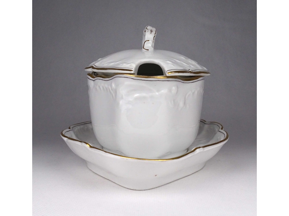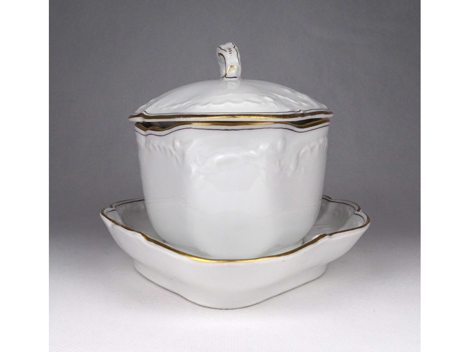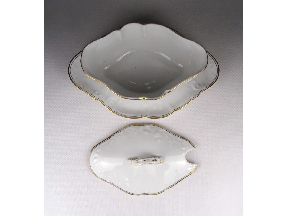 Antik, hibátlan állapotú, jelzetlen, aranyozott szélű, barokkos fedeles porcelán mártásos, szószos kínáló tál.