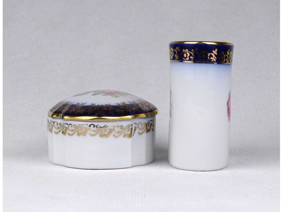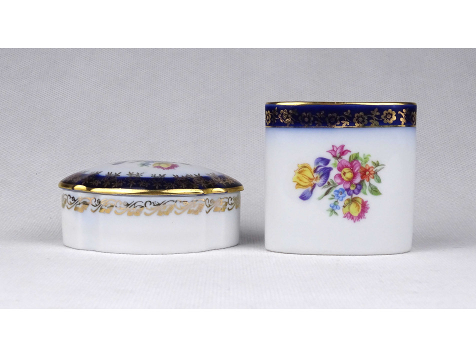 Hibátlan állapotú, kobaltkékkel és arannyal díszített német porcelán tárgyak. Egy cigaretta kínáló és egy ékszertartó bonbonier, szelence.