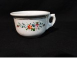 Régi, szép állapotú jelzett cseh porcelán bögre, oldalán szerecsen babákkal játszó két göndör hajú kislány díszítés. A fülénél hajszálrepedés található. Extra vastag falú, komacsésze vastagságú porcelán bögre.