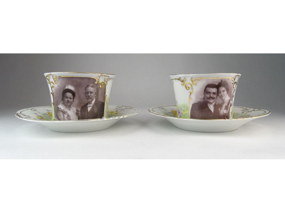 Szép állapotú, antik, jelzett, porcelán teáscsésze pár, az 1900-as évek első feléből. Rajta családi fotó díszítés, gazdag aranyozás található.