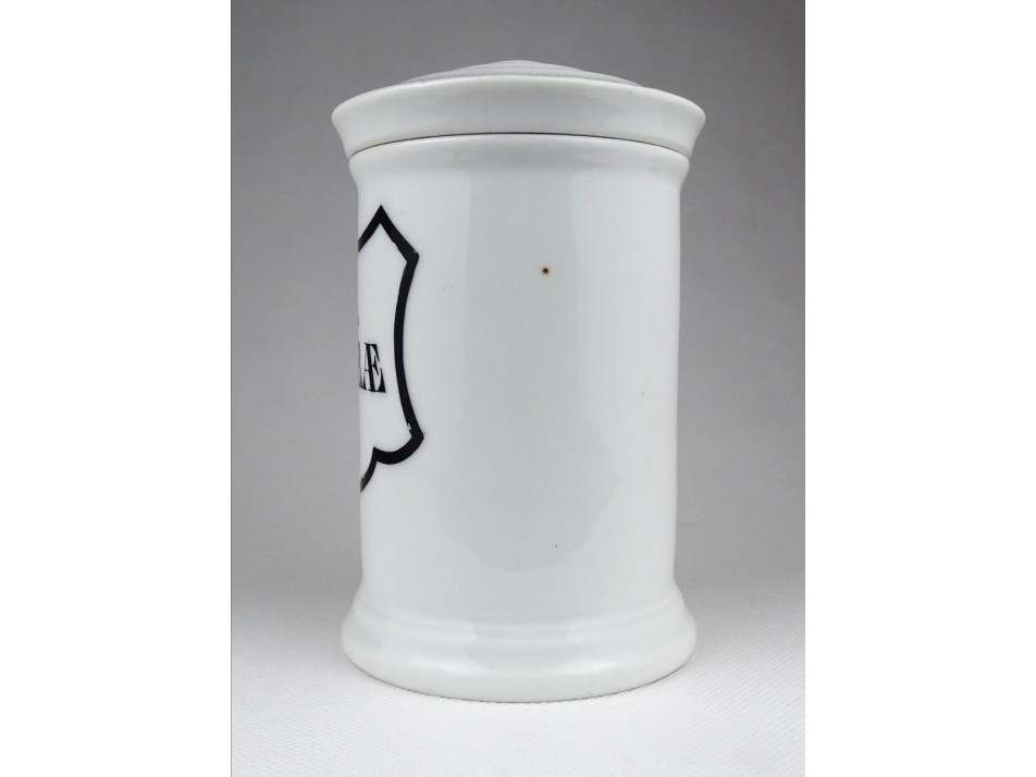 Régi, fedeles, jelzetlen, szép állapotú, feliratos gyógyszertári porcelán edény, porcelán patika tégely.