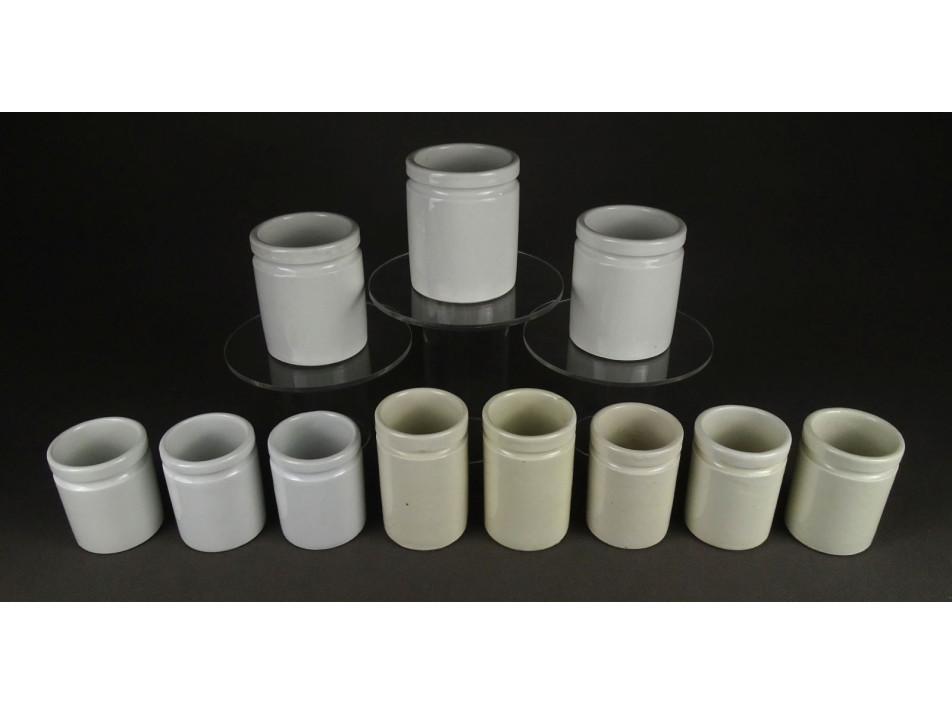 Régi hibátlan állapotú, porcelán gyógyszertári tároló edény, patika tégely készlet, 11 darab:
