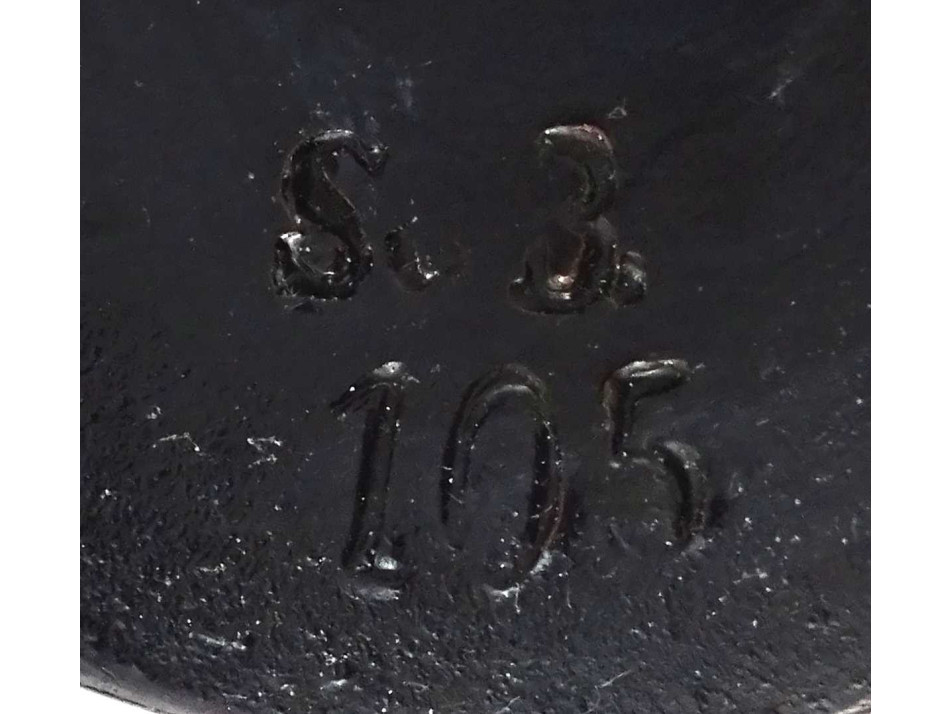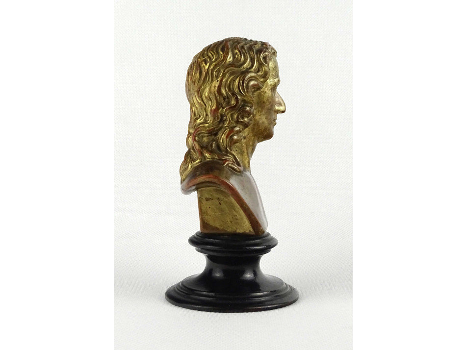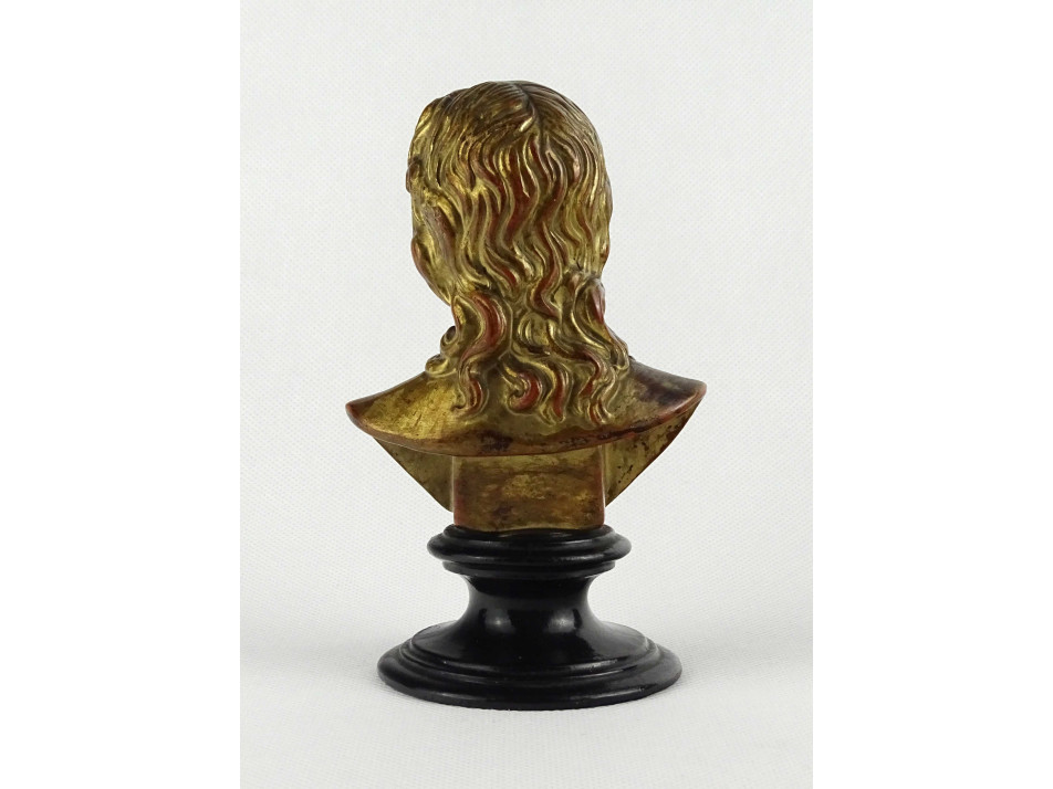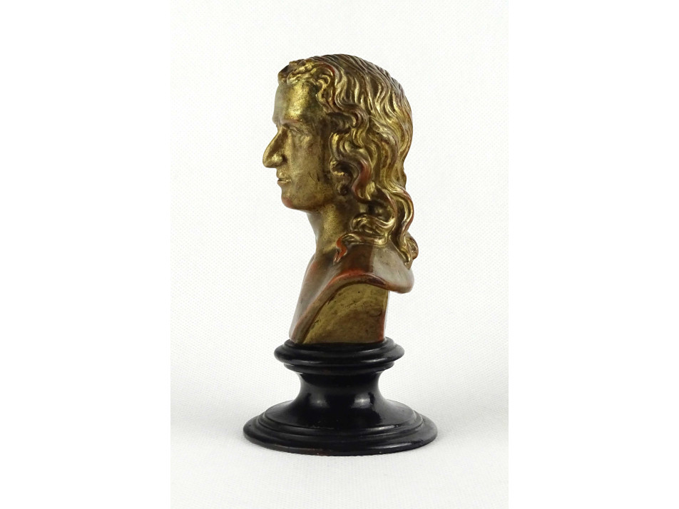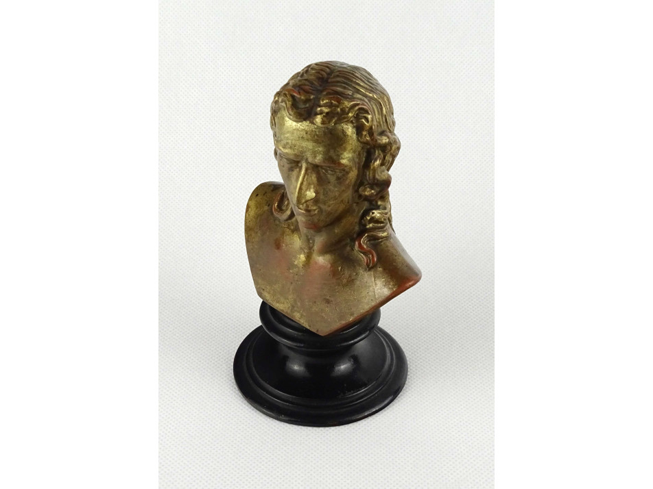 Antik, hibátlan állapotú, kisméretű jelzett terrakotta férfi büszt. A szobor talapzata feketére, a mellszobor arany színűre festett.
