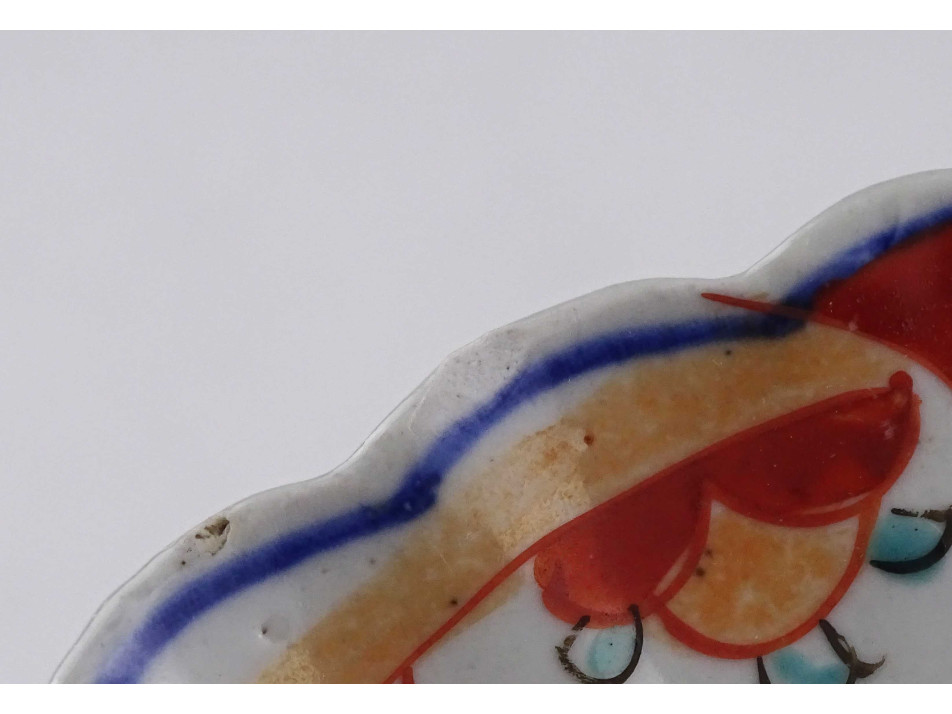 Antik, szép állapotú, gazdagon díszített, kézzel festett, japán porcelán dísz tál, falitál. A tányéron fémből hajlított pánt található, aminél fogva falra akasztható. Peremén egy apró lepattanás látható.