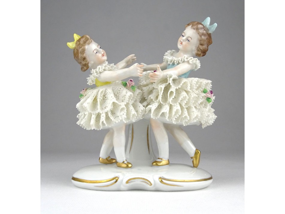 Régi, jelzett német porcelán figura, táncoló kislány pár talapzaton.