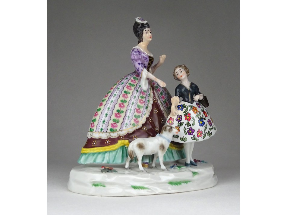 Antik jelzett francia porcelán szobor. Barokkos porcelán figura talapzaton. Rakott szoknyás hölgy, mellette kislány és bárány masnival. A szobor több helyen profi restaurátor által javított.