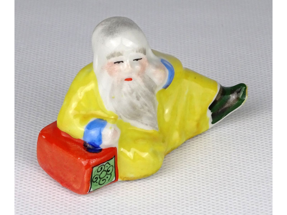Hibátlan állapotú, kis méretű, kézi festéssel díszített sárga színű kínai bölcs porcelán figura.