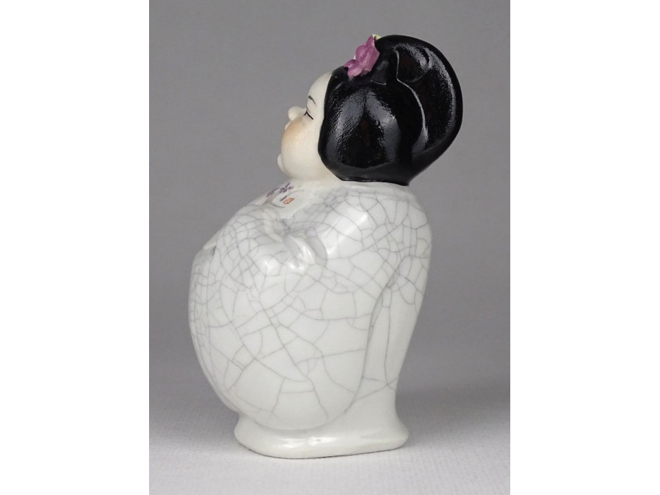 Régi ritka art deco porcelán figura. Kis méretű mosolygós japán nő porcelán figura. A virág hajdíszek javítottak.