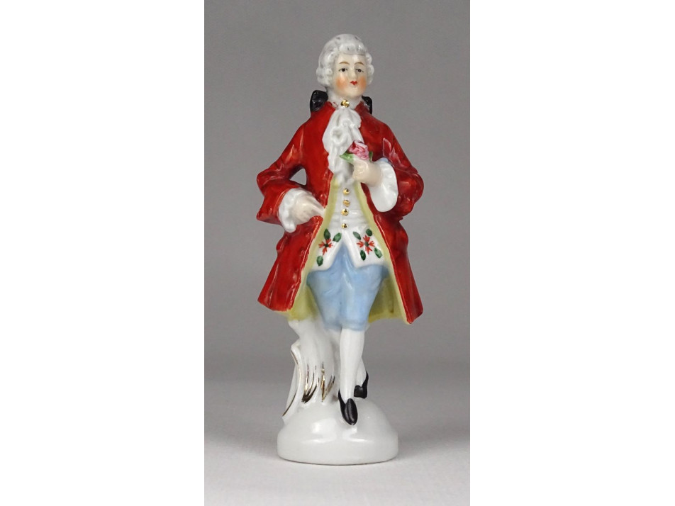 Hibátlan állapotú régi kézzel festett porcelán figura. Piros kabátos, rizsporos parókás rokokó férfi, kezében virággal.