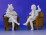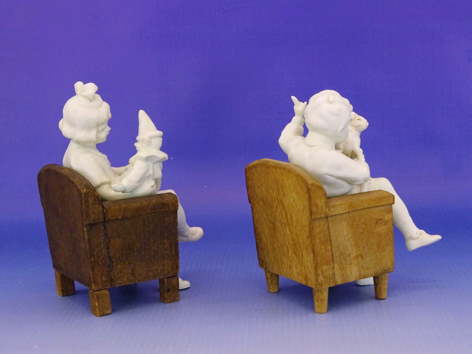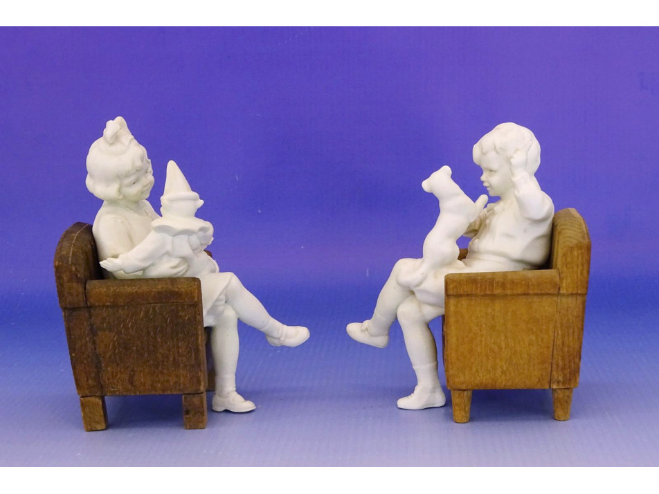 Hibátlan állapotú, biszkvit porcelán ülő szobor pár. A kislány bohóccal játszik a kisfiú kiskutyát tanít, idomít. A szobrokhoz fából faragott fotelek tartoznak.