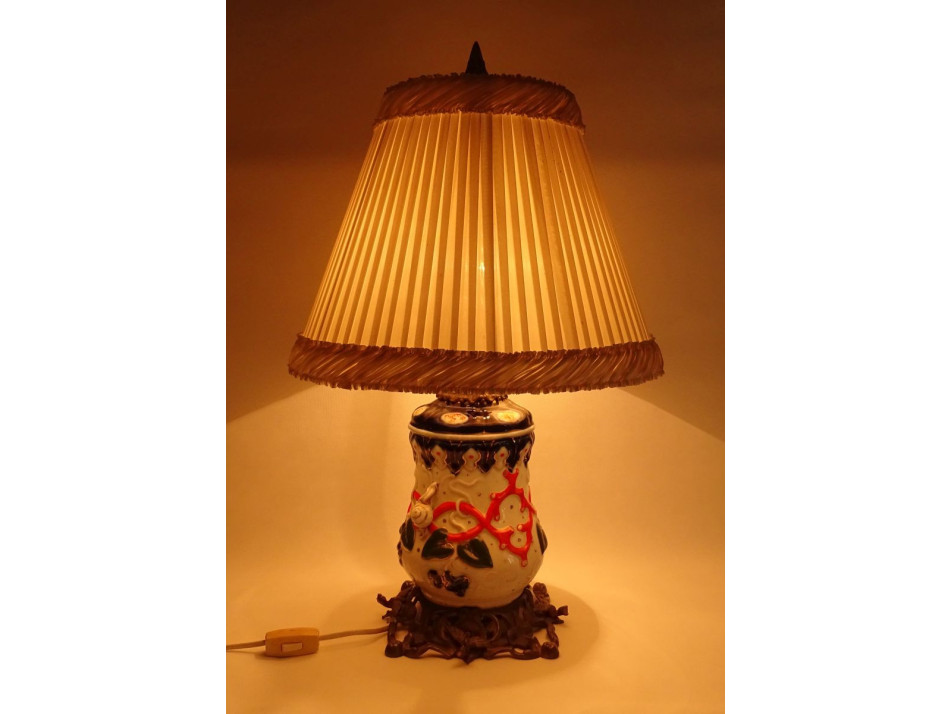 Régi nagy méretű porcelántestű lámpa. Szépen kimunkált madaras réz talpon áll. Működőképes, használható állapotban van. Egy darab nagy méretű (E27) izzó való bele.