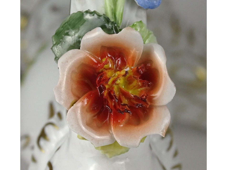 Szép állapotú, régi, aranyozott, barokkos porcelán gyertyatartó pár. Mindkettő háromágú, négygyertyás levehető felső résszel rendelkezik. A gyertyatartók plasztikus virágokkal díszítettek. Ezek közül egy-egy darabon apró sérülés található.